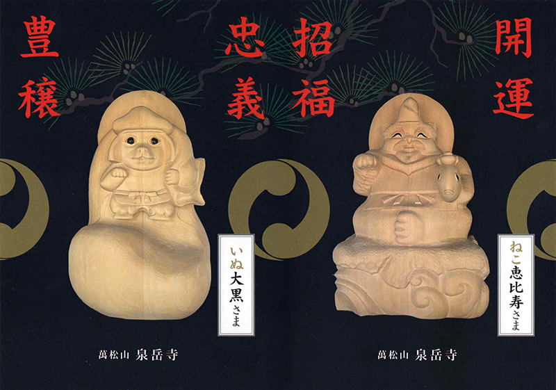 傍には幸福と繁栄を祈願し、ユニークないぬ大黒さま、ねこ恵比寿さまがお祀りされています。赤穂四⼗七義士の心をモチーフに志保見道⼀師に制作をいただきました。